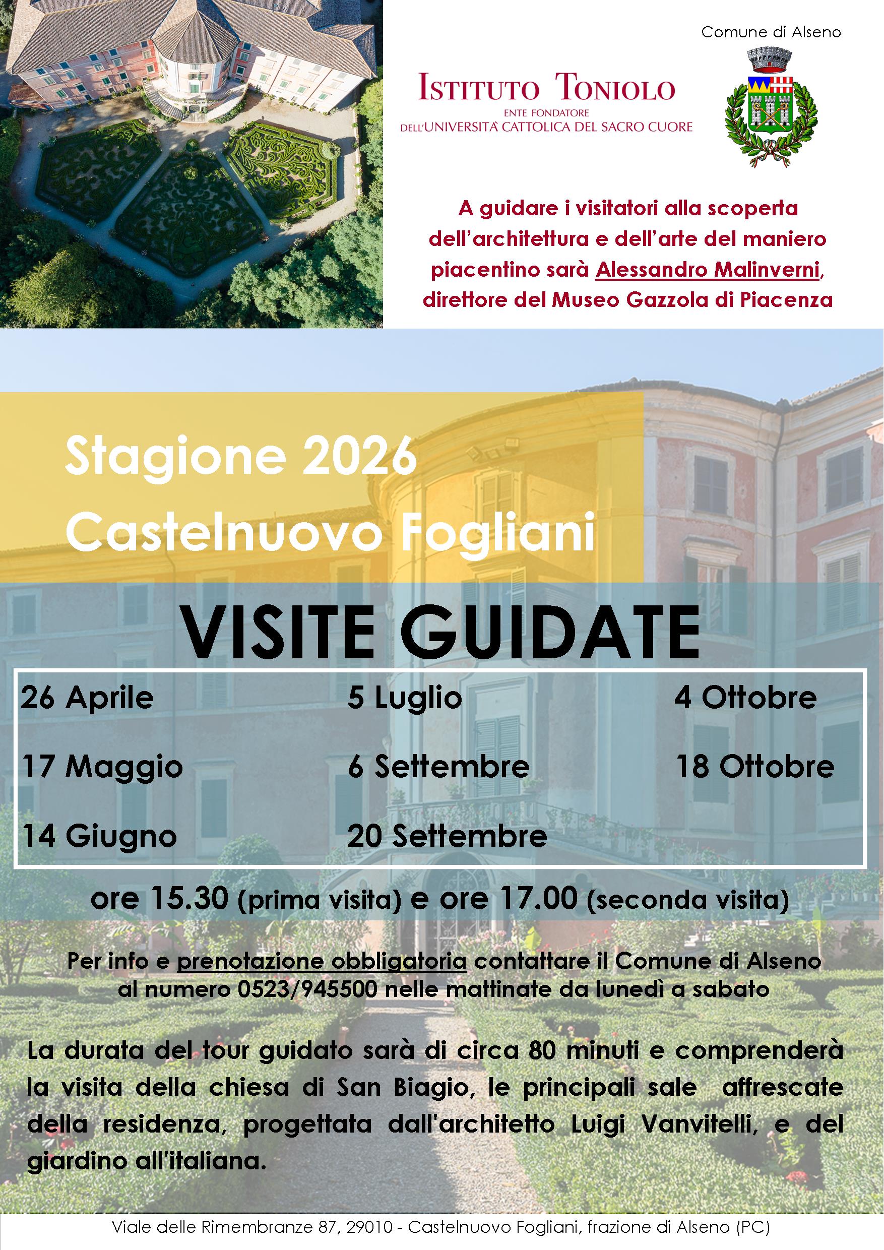 Il Comune di Alseno, in collaborazione con l’Istituto Toniolo, ha rinnovato anche per l’anno 2026 la possibilità di visitare la piccola reggia di Castelnuovo Fogliani. Gli spazi interni dell’antico castello medievale vennero convertiti in residenza per i duchi Fogliani Sforza d’Aragona su disegno del Vanvitelli.