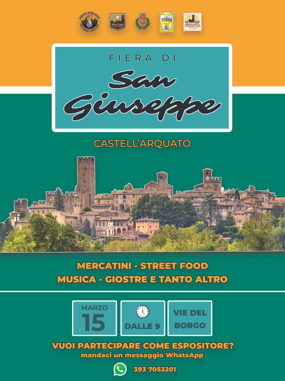 In occasione del santo patrono di Castell’Arquato, San Giuseppe, domenica 15 marzo una giornata di festa: ai piedi del borgo, in via Roma e Piazza Europa, i mercatini di Curiosando a Castell’Arquato; in piazza San Carlo le giostre per i più piccoli. Tutto il giorno, per le vie del borgo, musica e street food.