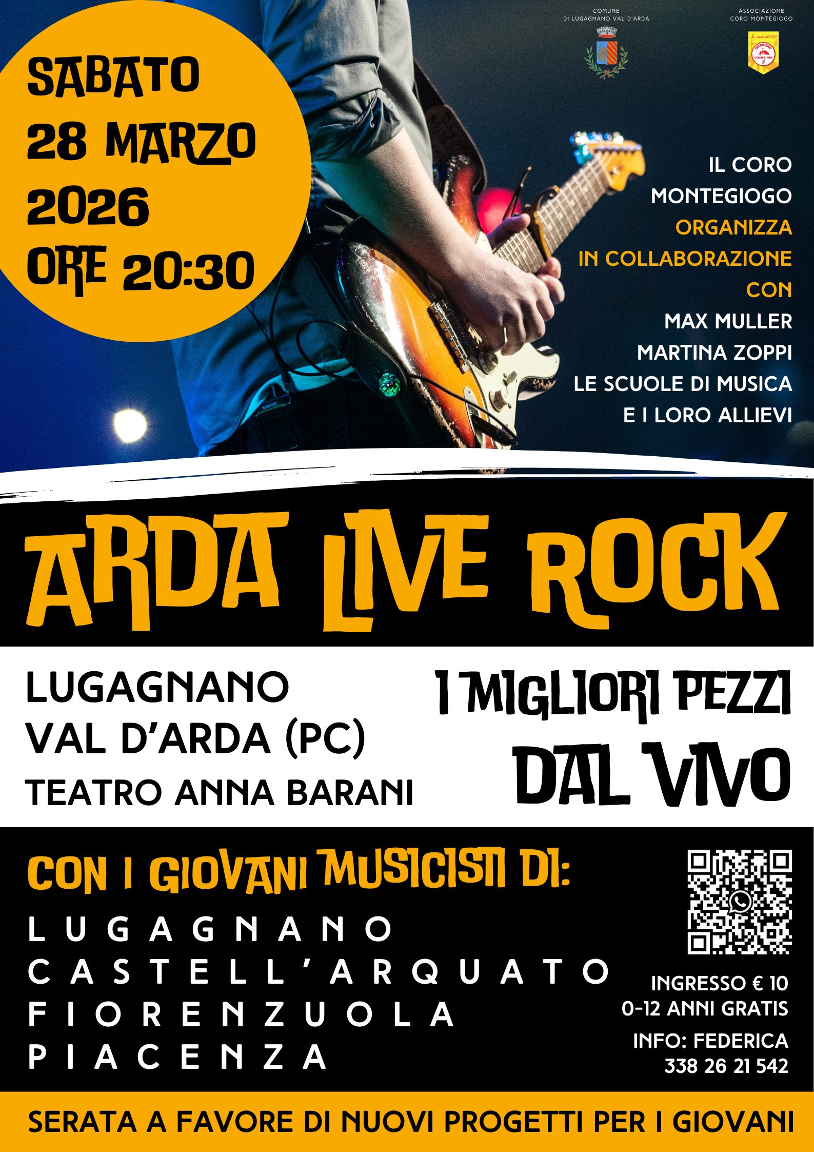 Il Coro Montegiogo, in collaborazione con Max Muller, Martina Zoppi e le scuole di musica del territorio, organizza una serata con musica dal vivo in compagnia dei giovani musicisti di Lugagnano, Castell’Arquato, Fiorenzuola e Piacenza. Obiettivo della serata: finanziare nuovi progetti per i giovani del paese. Ingresso 10,00 €, gratis under 12. Per maggiori informazioni: 338 2621 542 (Federica).
